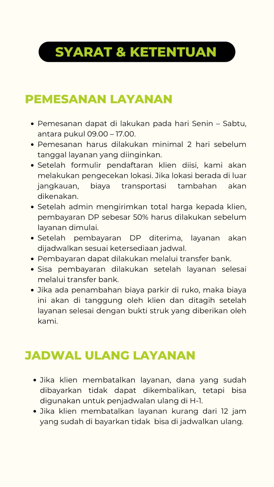 Kami berkomitmen untuk memberikan hasil pembersihan yang menyeluruh, terperinci, dan berkualitas tinggi, dengan tetap menjaga harga yang kompetitif dan terjangkau. Setiap layanan kami dirancang untuk memenuhi kebutuhan spesifik pelanggan, dengan standar kebersihan yang konsisten dan profesionalisme yang dapat diandalkan.